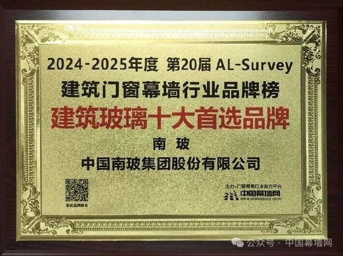 在年会现场,主办方公布了2024-2025年度“top幕墙工程项目”以及“top首选材料品牌”名单。南玻集团凭借多年的匠心坚守和稳健经营,最终赢得广大终端客户、行业专家、房地产企业、设计院、顾问公司的一致认可,在第20届al-survey2024-2025建筑门窗幕墙行业数据调查活动中再次蝉联“建筑玻璃十大首选品牌”。